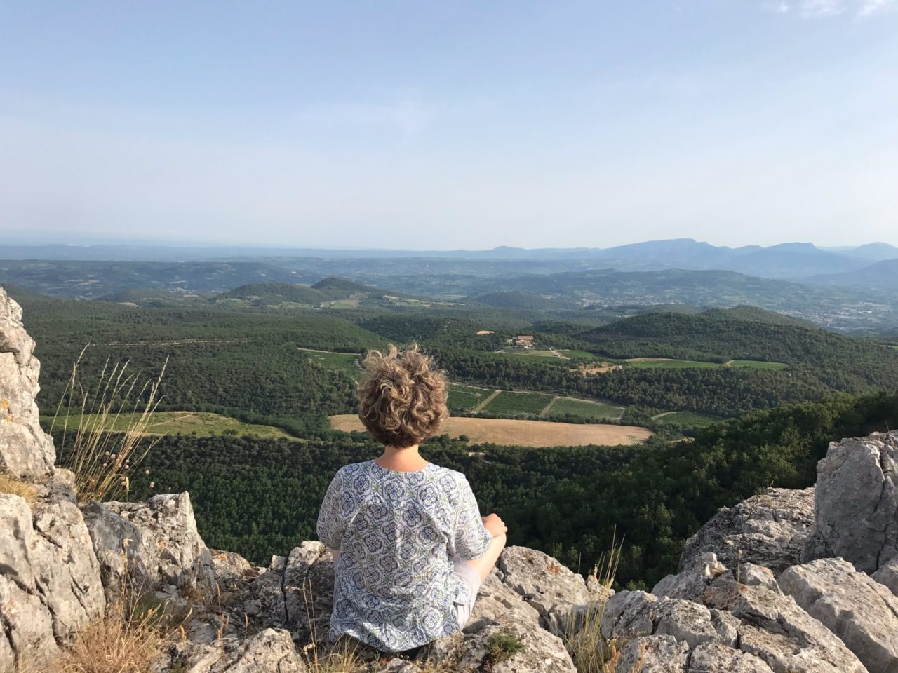 Regarder l’horizon procure l’apaisement Juillet 2021… Tôt le matin, après 1 h d’ascension, nous nous asseyons en silence sur le chaos rocheux de la crête. Chacun sa place, tous