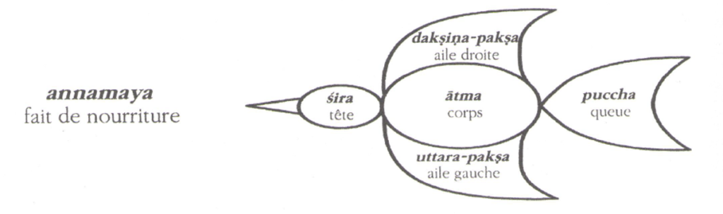 L’être humain est tissé de cinq « corps », en interactions incessantes les uns avec les autres, représentés par des corps d’oiseaux (Taittirīya Upaniṣad). Le premier corps (dessin ci-dessous provenant de TKV Desikachar) est annamaya. C’est l’enveloppe matérielle, elle forme avec prānāmaya le corps dit « grossier » (sthulasarira), dense, qu’on peut toucher. Maya veut dire « fait de » et anna « nourriture », annamaya est donc le corps fait de nourriture, qui se constitue par la nourriture, cela signifie que les aliments que nous ingérons deviennent du « soi », et que nous nous construisons, nous régénérons, évoluons, nous soignons par la nourriture.
